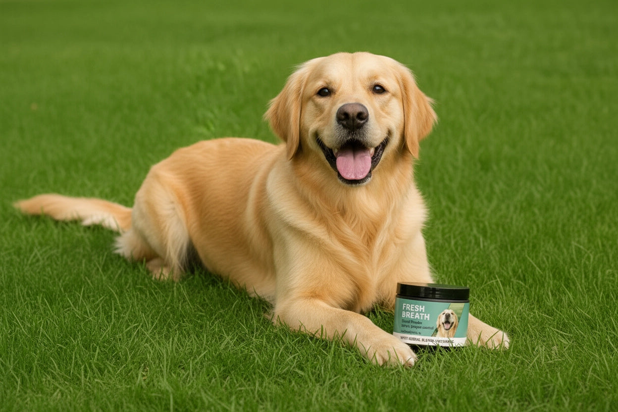 Safe, natural dental powder that freshens your dog’s breath fast — while preventing tartar and gum problems long-term.