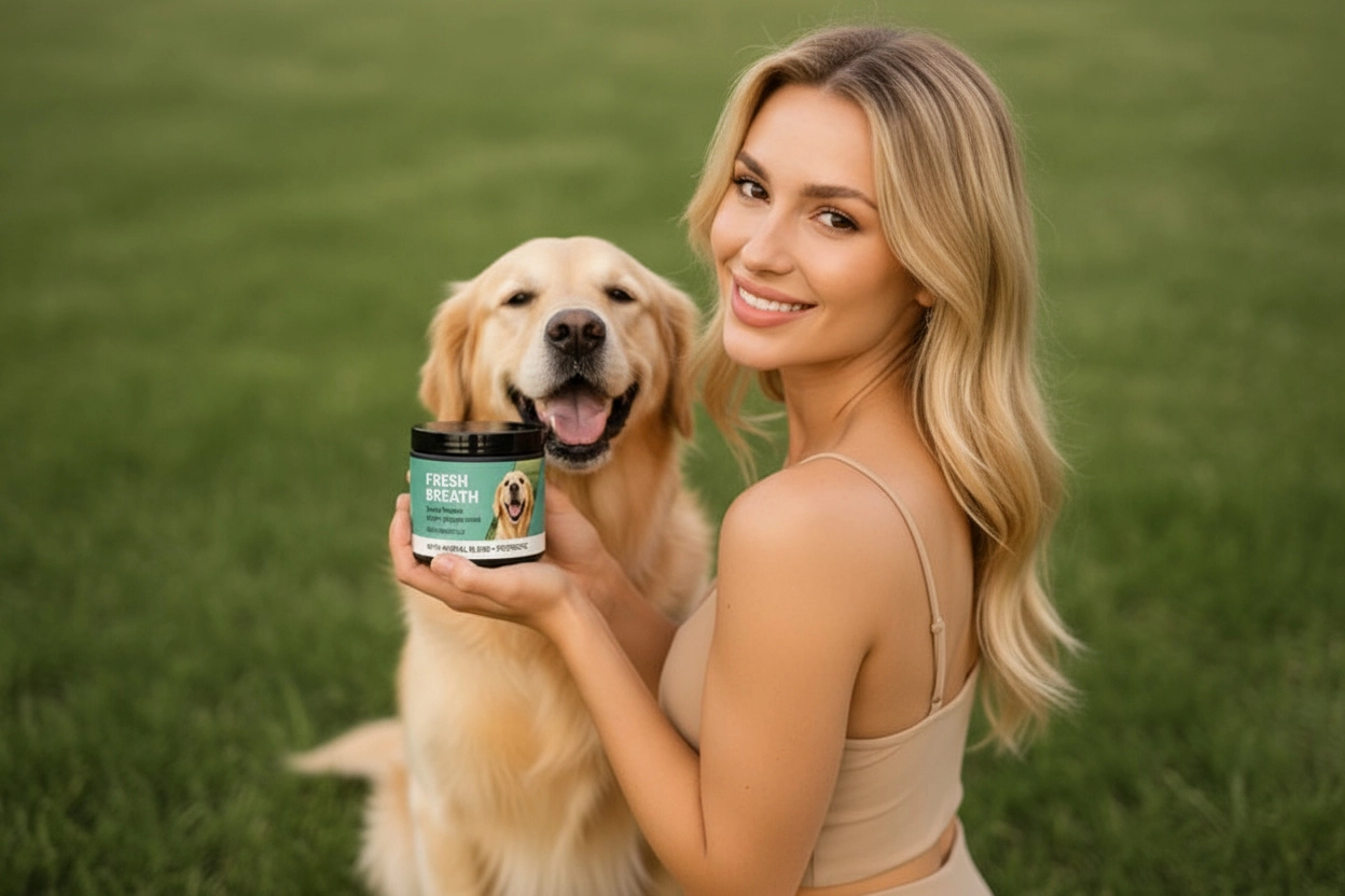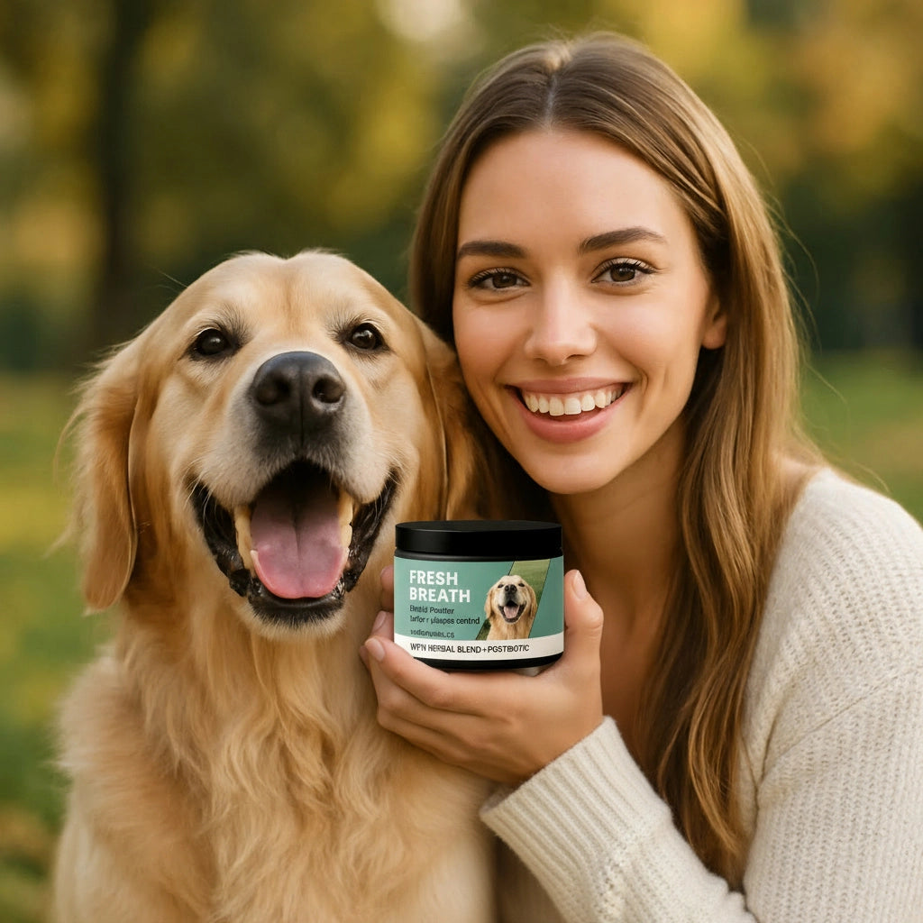 Skip the toothbrush battles. Just sprinkle Fresh Breath Powder on your dog’s food for cleaner teeth, fresher breath, and better health — all in one simple daily routine.